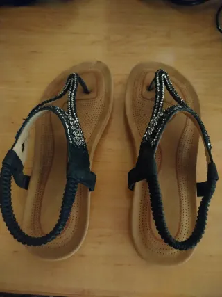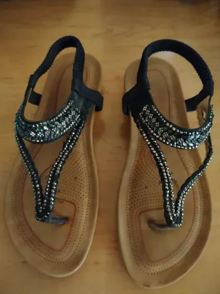 ¡Elegancia y brillo para tus ocasiones especiales! Vendo preciosas sandalias de tacón de la marca Claudia Chic, talla 38. Son de color negro con un acabado satinado muy sofisticado y detalle de pedrería/lentejuelas en la tira delantera que les da un toque brillante ideal para bodas, graduaciones o salidas nocturnas. Marca: Claudia Chic. Talla: 38. Color: Negro satinado. Diseño: Tira delantera adornada y cierre de hebilla ajustable al tobillo. Tacón: Tacón fino de altura media (muy cómodo para aguantar horas). Estado: Muy bien cuidadas