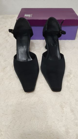 Zapato de fiesta negro tipo raso T41. correa tobillera ajustable. Usados en contadas ocasiones pero en buen estado..tacón de 8cm tapa incluida