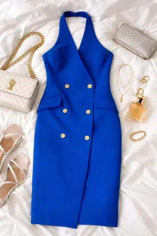 Vestido tipo blazer cruzado en azul eléctrico intenso. Tiene un corte muy elegante y queda precioso para bodas, eventos, cenas o fiestas. 🔹 Escote halter en pico que estiliza cuello y hombros 🔹 Diseño tipo blazer con doble botonadura frontal 🔹 Botones metálicos decorativos 🔹 Corte entallado que marca la silueta 🔹 Tejido con buen peso y caída 🔹 Forro interior negro (no transparente) 🔹 Cierre interior con botón y presilla para mejor ajuste Color muy favorecedor y fácil de combinar con sandalias o accesorios dorados o plateados. 💰 Precio original: • 59,95 € en España • 65,95 € en el resto de Europa Vestido ideal.
