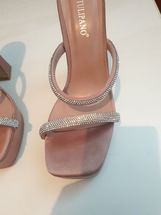 Elegantes sandalias de tacón, perfectas para ocasiones especiales. - Diseño adornadas con pedrería. - Cierre de hebilla en el tobillo. - Tacón de aguja. - Material satinado. Venir a buscar a Carabanchel Alto. Madrid