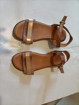 Elegantes sandalias de fiesta con un llamativo acabado metalizado dorado.talla 36 - Diseño con tiras finas. - Tacón bajo y fino elegante y cómodo. Nuevas a estrenar.
