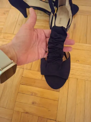 Elegantes sandalias de fiesta con un diseño llamativo. - Tiras cruzadas en la parte delantera. - Correa ajustable en el tobillo. - Tacón fino. Y no es alto el tacón Solo usadas en una boda se ven por las fotos Son muy cómodas Suela fina
