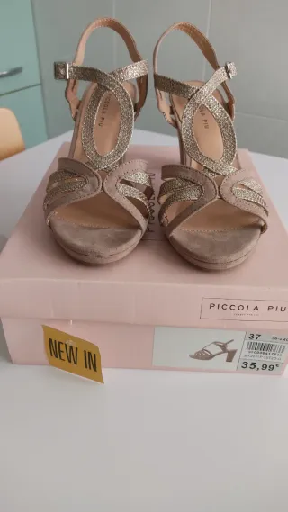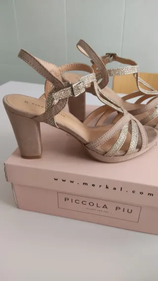 Sandalias preciosas de tacón y plataforma, cómodas totalmente de piel. Fabricadas en España. Compradas en tacatuca Zaragoza. Costaron 130 euros. Medidas: plataforma 3,5 cm, tacón 10,5 cm. Quedan espectaculares pero tengo demasiados esguinces de tobillo por el deporte. Marca Ezzio. Yo llevo un 39-40 y me van perfectas