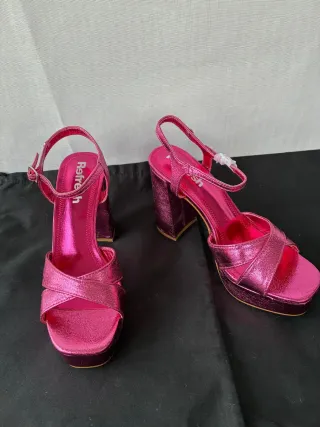 Sandalias de plataforma con un vibrante color fucsia. - Medida interior 24 centímetros. - Diseño de tiras cruzadas en la parte delantera. - Correa ajustable al tobillo con hebilla. - Tacón grueso y plataforma. - Acabado brillante metálico.