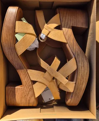 Usadas una vez. Sandalias de cuña con diseño de madera. - Tiras cruzadas en ante. - Hebilla ajustable. - Plataforma de madera.