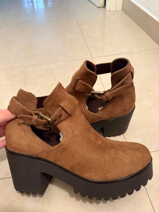 Botines de plataforma de la marca Carmel en color marrón. - Diseño abierto tipo sandalia. - Cierre con hebilla. - Tacón grueso y plataforma dentada.