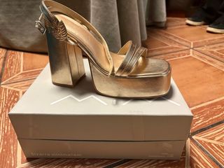 Sandalias Zara Plataforma Tacón Alto Doradas Talla