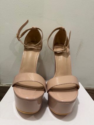 Elegantes sandalias rosa doradas con tacón y plataforma. - Diseño de tiras cruzadas en la pala. - Correa ajustable al tobillo con hebilla. - Tacón cuadrado y plataforma. - Acabado metalizado Numero 36 Estrenadas un rato en una boda Altura tacón 10 cm.