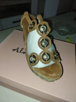 Elegantes sandalias con un diseño único. - Tira con apliques circulares. - Detalle de pedrería y adornos dorados. - Plataforma con acabado de esparto. -algo negociable