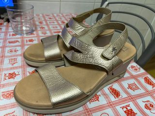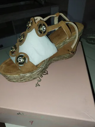Sandalias de cuña con un diseño moderno y llamativo. -Marca: POPA BRAND -Hechas en España. -Material: piel de primera calidad, esparto y caucho (suela). - Tiras en acabado metalizado dorado y plateado. - Plataforma forrada de esparto. - Cierre con cordones finos. - Detalle de hilo brillante en la suela. (SU PRECIO ES DE 90€, PERO ME LAS REGALARON ESTE VERANO SIN TICKET REGALO Y NO LAS PUEDO CAMBIAR, POR ESO LAS VENDO).