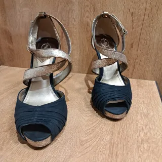 Elegantes sandalias con tacón y plataforma. - Diseño de tiras finas. - Acabado metalizado brillante. - Cierre de hebilla ajustable. Nueva con etiqueta