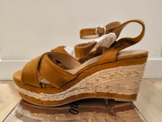 Sandalias de cuña con plataforma, con tiras cruzadas de color marrón y detalles dorados en la cuña. Altura del tacón 8cm. Talla 39. Nuevos a estrenar en su caja original - Material exterior tipo ante. - Correa ajustable al tobillo. - Plataforma delantera. - Cuña con acabado de esparto y detalles dorados.