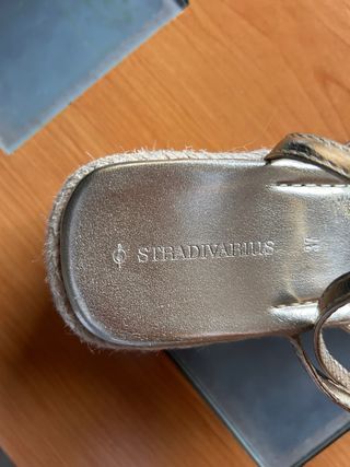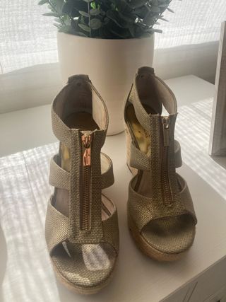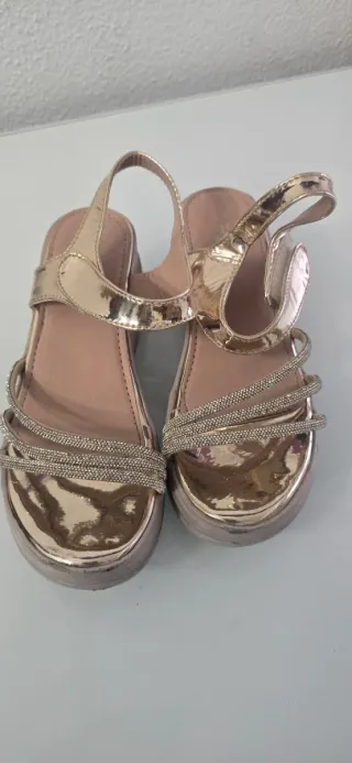 Elegantes cuñas en color dorado, perfectas para añadir un toque de brillo a tu atuendo. - Diseño de cuña con plataforma. - Tiras ajustables al tobillo. - Detalle de esparto en la suela. Obs: tiene salido un poco del brillo en uno, pero es pequeño. Nunca lo he usado, pero creo qye ha sido al transportarlo.