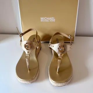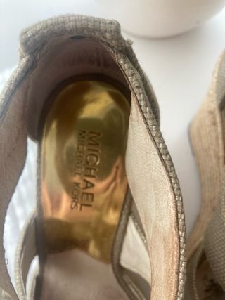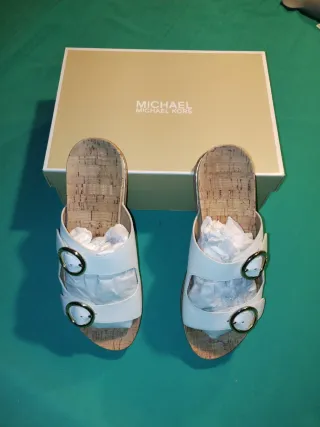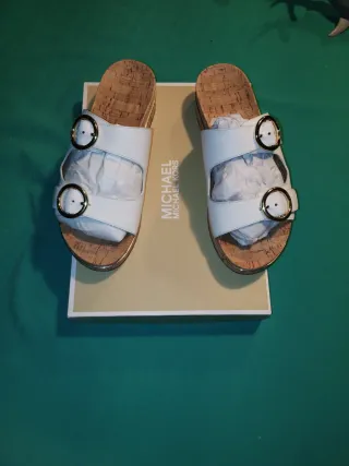 Sandalias de la marca Michael Kors con un diseño elegante. - Tiras blancas con hebillas doradas. - Suela de corcho. - Detalle de plataforma.puedras dos veces, prácticamente muevas.