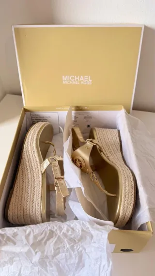 Sandalias de cuña Michael Kors en color dorado. - Diseño tipo pala con tira central. - Detalle de logo MK en la pala. - Plataforma forrada de esparto. - Cierre con pulsera al tobillo.