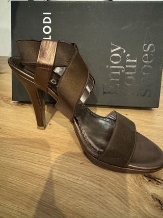 Elegantes sandalias de la marca LODI. - Diseño con tiras elásticas cruzadas. - Acabado metalizado en tono bronce. - Tacón fino y plataforma delantera.