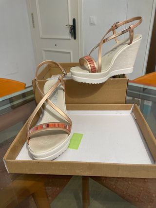 Sandalias doradas de plataforma. Ideales para verano. - Son de color dorado. - Tienen una plataforma de esparto. - Están nuevas, solo se han usado una vez.