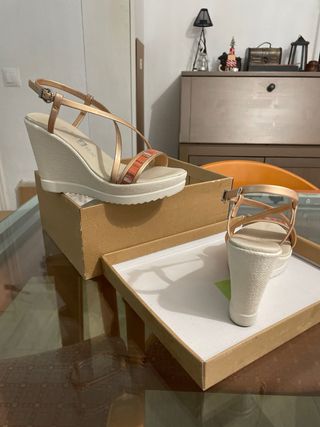 Sandalias plataforma en tonos blancos y dorados. Ideales para verano. - Son de cuña. - El material parece piel sintética. - Tienen cierre de hebilla.