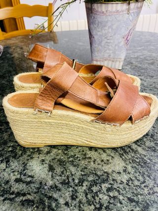 Sandalias de esparto con un diseño moderno y cómodo. El interior es acolchado y muy cómodo. Usado escasas veces, como nuevos. Calzo un 36’5 y me van bien, tallan grande. - Plataforma con acabado en yute. - Tira superior de esparto. - Plantilla de material sintético.