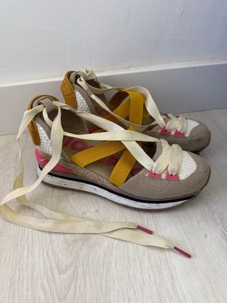 Sandalias de cuña con un diseño cruzado y detalles de la marca. Sólo tienen marcado algo los deditos pero el restante está perfecto. - Color coral vibrante. - Tiras cruzadas con logo. - Hebilla ajustable en el tobillo. - Plataforma de esparto.