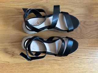 Sandalias de cuña con tiras negras y detalle de esparto. - Cierre con hebilla dorada. - Plataforma de esparto. - Talla 41. - Tacón 7 cm - Sin uso. Se vende porque no uso tacones. Fue un regalo. - Precio original 39.99