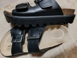 Sandalias de la marca Pull&Bear con un diseño moderno. - Tiras negras con hebillas metálicas. - Suela de corcho y plataforma negra.