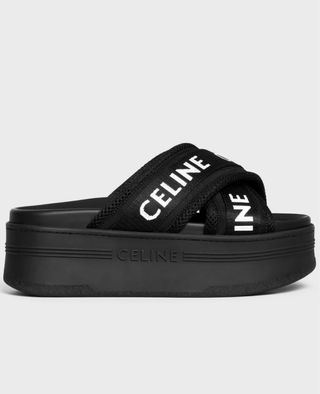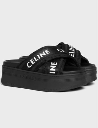Chanclas de plataforma con tiras cruzadas de malla. - Tiras con logo CELINE repetido. - Suela gruesa y cómoda. - Diseño moderno y versátil.