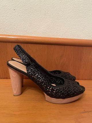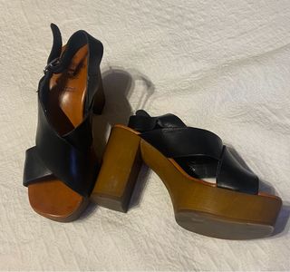 Sandalias de cuero negro con un diseño de tiras y plataforma simulando madera. - Material exterior: cuero. - Color de la suela: marrón. - Cierre con hebilla. -Material ligero, no pesan a pesar de su tacón. La suela tiene efecto envejecido. Completamente nuevas como se ve en las fotos.