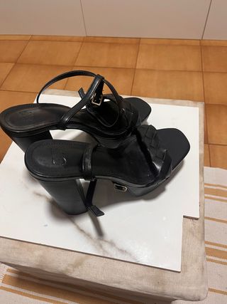 Sandalias de tacón con un diseño elegante y moderno. Están en excelente estado, como nuevas. - Tacón de plataforma. - Tiras con detalle de pespuntes. - Cierre de hebilla ajustable.