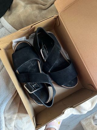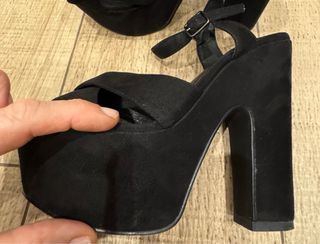 Elegantes sandalias piel de ante negras con plataforma, plantilla interior y suela también de piel. - Tacón grueso. - Tiras finas en la parte delantera. - Cierre de hebilla en el tobillo. - Detalle dorado en la plantilla. - su precio eran de unos 300€