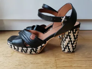 Lottusse - Sandalias de tacón. - núm.40,5 (medidas en la foto de las suelas). - Material: rejilla de piel en color negro. - Tacón grueso en madera y plataforma delantera. - Cierre de hebilla ajustable. Poco uso, en excelente estado.