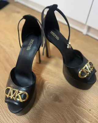 Elegantes tacones Michael Kors con detalles dorados. - Diseño de plataforma. - Tira al tobillo. - Adorno metálico con logo en la pala.
