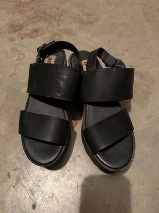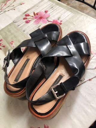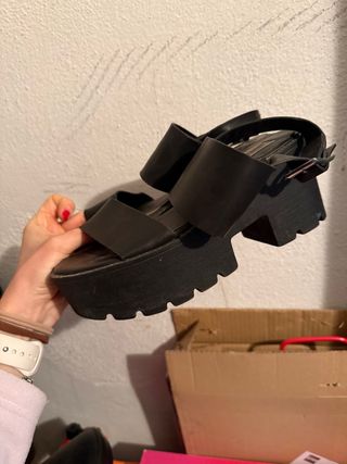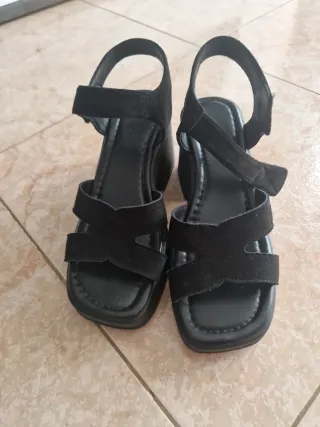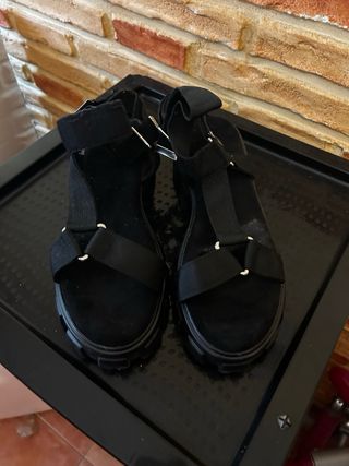 Sandalias negras con plataforma. - Diseño moderno. - Plataforma alta. - Son muy cómodas a la vez que altas porque llevas el pie prácticamente en plano. Subes centímetros sin sacrificar comodidad :) - Las vendo porque no las uso, pero están como nuevas.