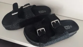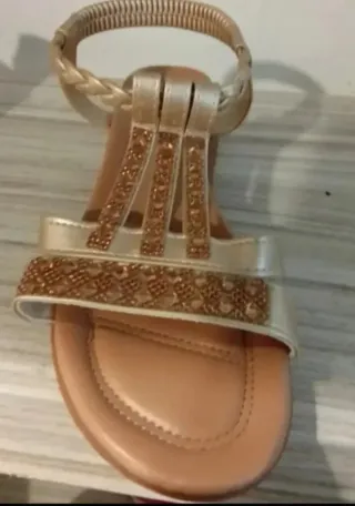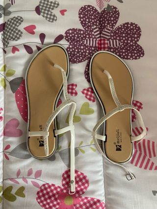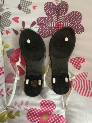 Chanclas de dedo sin estrenar, perfectas para el verano o la piscina de invierno. - Diseño con tiras adornadas con pedrería dorada y plateada. - Suela cómoda y plana. MEDIDAS PLATAFORMAS: - parte delantera 2,5 cm - parte trasera 5,3 cm