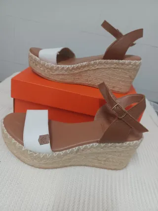 Sandalias de cuña de la marca Popa#39 (25,5 cm)plantilla - Diseño de tiras en blanco y marrón. - Plataforma con acabado de esparto. - Cierre de hebilla en la tira del tobillo.