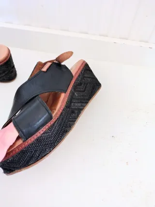 Conjunto de sandalias de diferentes estilos. - Sandalias de cuña con tiras negras y suela de esparto. - Sandalias planas negras con tiras cruzadas. - Sandalias negras con plataforma y detalle de esparto.la beis es de piel