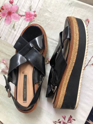 Sandalias de Pull&Bear con tiras cruzadas y hebilla. Se ven "chafadas" porque llevan mas de 5 años en el zapatero - Diseño de plataforma. - Tiras negras brillantes. - Cierre con hebilla metálica.