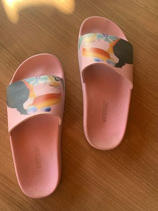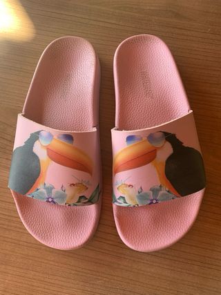 Sandalias planas de la marca The White Brand en talla 36. Rosas con estampado de tucán. Con un poco de plataforma, muy cómodas.