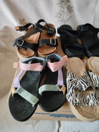 Lote de sandalias planas. - Sandalias negras con tiras. - Sandalias negras con plataforma. - Sandalias multicolor con tiras. - Sandalias con estampado de cebra y plataforma.