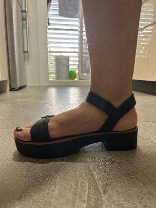 Sandalias negras de plataforma. Son cómodas y elegantes. - Diseño cruzado. - Hebilla ajustable. - Suela blanca. - Plantilla de gel.