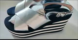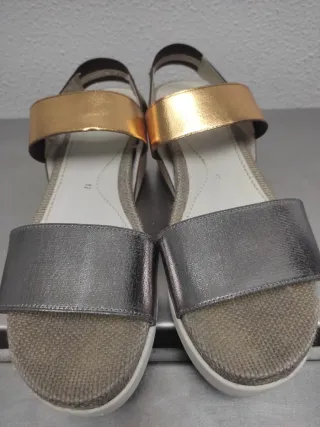 Sandalias de cuña con un diseño moderno y llamativo. -Marca: POPA BRAND -Hechas en España. -Material: piel de primera calidad, esparto y caucho (suela). - Tiras en acabado metalizado dorado y plateado. - Plataforma forrada de esparto. - Cierre con cordones finos. - Detalle de hilo brillante en la suela. (SU PRECIO ES DE 90€, PERO ME LAS REGALARON ESTE VERANO SIN TICKET REGALO Y NO LAS PUEDO CAMBIAR, POR ESO LAS VENDO).