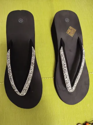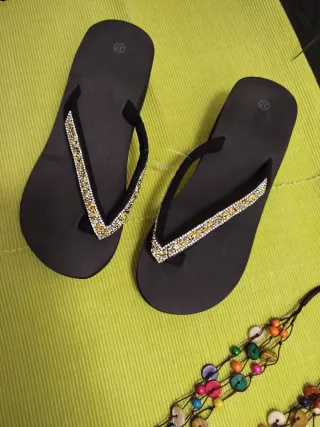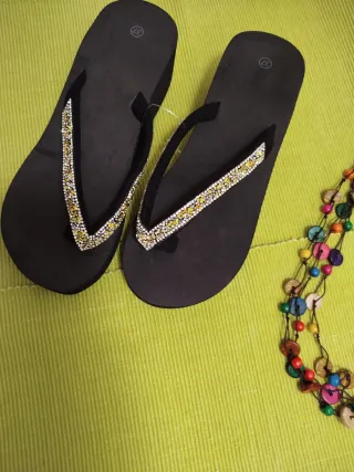 Chanclas de dedo sin estrenar, perfectas para el verano o la piscina de invierno. - Diseño con tiras adornadas con pedrería dorada y plateada. - Suela cómoda y plana. MEDIDAS PLATAFORMAS: - parte delantera 2,5 cm - parte trasera 5,3 cm