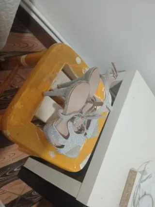 Elegantes sandalias de tacón alto con diseño de tiras cruzadas. - Tacón fino y plataforma delantera. - Cierre de hebilla en el tobillo. - Color plateado. - Número 38. - Altura tacón 10 cm. y altura plataforma 1,5 cm. - Usadas solo en una ocasión. - Tienen un pequeño roce en la plataforma de la sandalia del pie derecho (se adjunta foto).