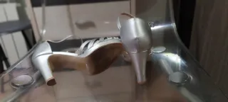 Sandalias de cuña con un diseño elegante y detalles brillantes. - Acabado en encaje plateado y blanco. - Lazos decorativos en los laterales. - Plataforma de cuña. - con agarre al tobillo - Solo un uso.