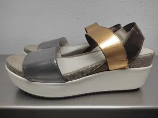 Sandalias de la marca Stonefly en talla 39. Combinan detalles en dorado y plateado, perfectas para un look moderno. Están si usar, solo dos ratos para probarlas en casa y lamentablemente me aprietan en la parte delantera, por eso las quito con mucha pena. Precio original 89.90€ - Diseño con tiras cruzadas. - Plataforma cómoda. - Materiales de calidad.
