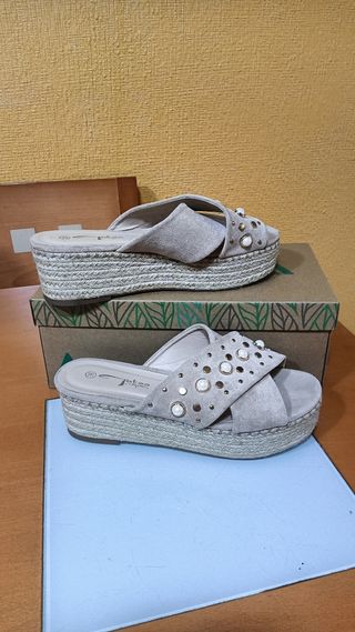 Buenas 36. Con cuña, muy cómodas. De rafia y piel