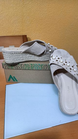 Sandalias de tacón con plataforma. No las he llegado a usar, se puede comprobar en la suela. Me resulta alto el tacón y no estoy acostumbrada.