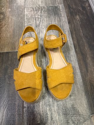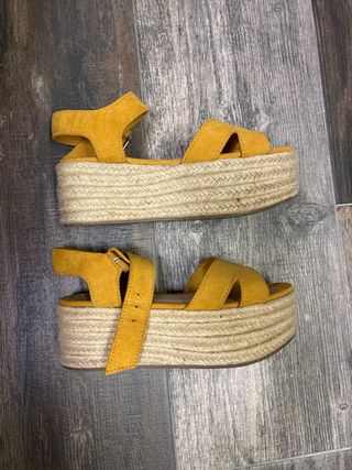 Tacones de estilo cuña en color mostaza, con muy poco uso. La plataforma les da un toque moderno y cómodo. - Material exterior tipo ante. - Correa ajustable en el tobillo. - Diseño de tiras cruzadas en la parte delantera. - Plataforma forrada de esparto.