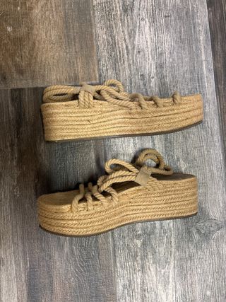 Sandalias planas de color marrón, perfectas para el verano. Son de plataforma y tienen un diseño entrecruzado. - Diseño de tiras cruzadas en la parte superior. - Plataforma de esparto. - Cierre de hebilla en el tobillo. Se han usado un par de veces