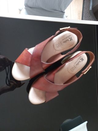 Sandalias de piel con un diseño elegante y cómodo. - Material exterior de piel. - Suela de plataforma de madera. - Cierre con hebilla. - Fabricadas en España.